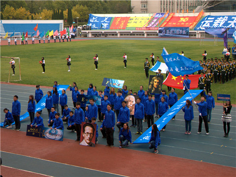 19日中午1点,运动会开幕式隆重召开。suncitygroup太阳新城方阵的运动员身穿蓝色运动服,迈着矫健的步伐走过主席台。他们手中高举牛顿、爱因斯坦和薛定谔的头像,以及这三位科学巨人提出的公式,展现了物理学对人类的巨大贡献。同时,他们高呼“物理光电,真金火炼,奋勇争先,突破极限”的口号,表达了物理健儿在运动会上力争上游的决心。